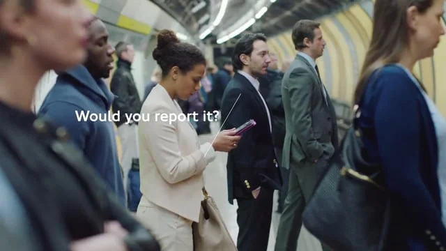 The interactive film shows a woman being leered at and then groped by a man. Each time he steps up his abusive behaviour, the viewer can choose whether they would report the incident. A voiceover then explains TfL’s zero-tolerance policy on unwanted sexual advances.